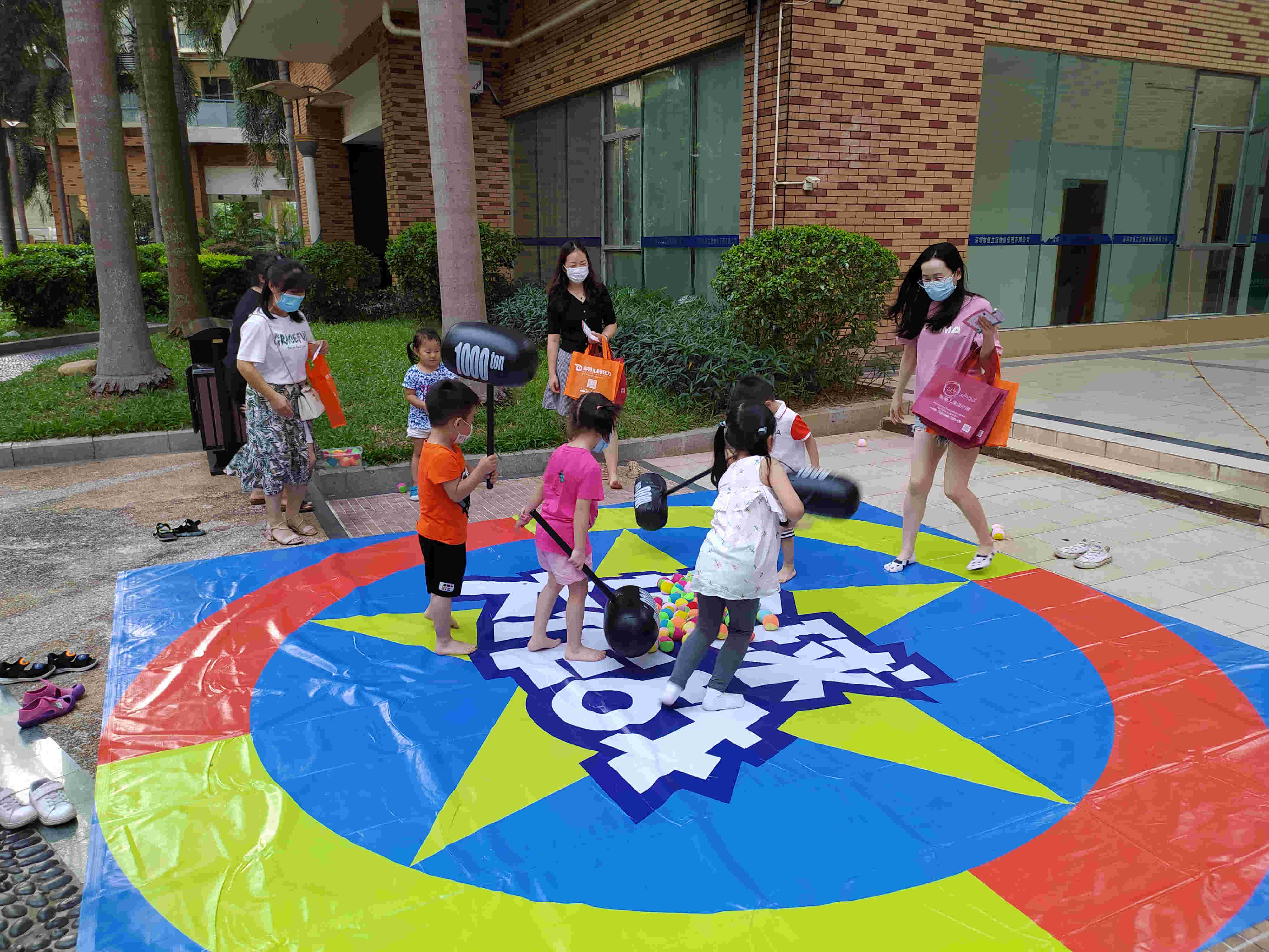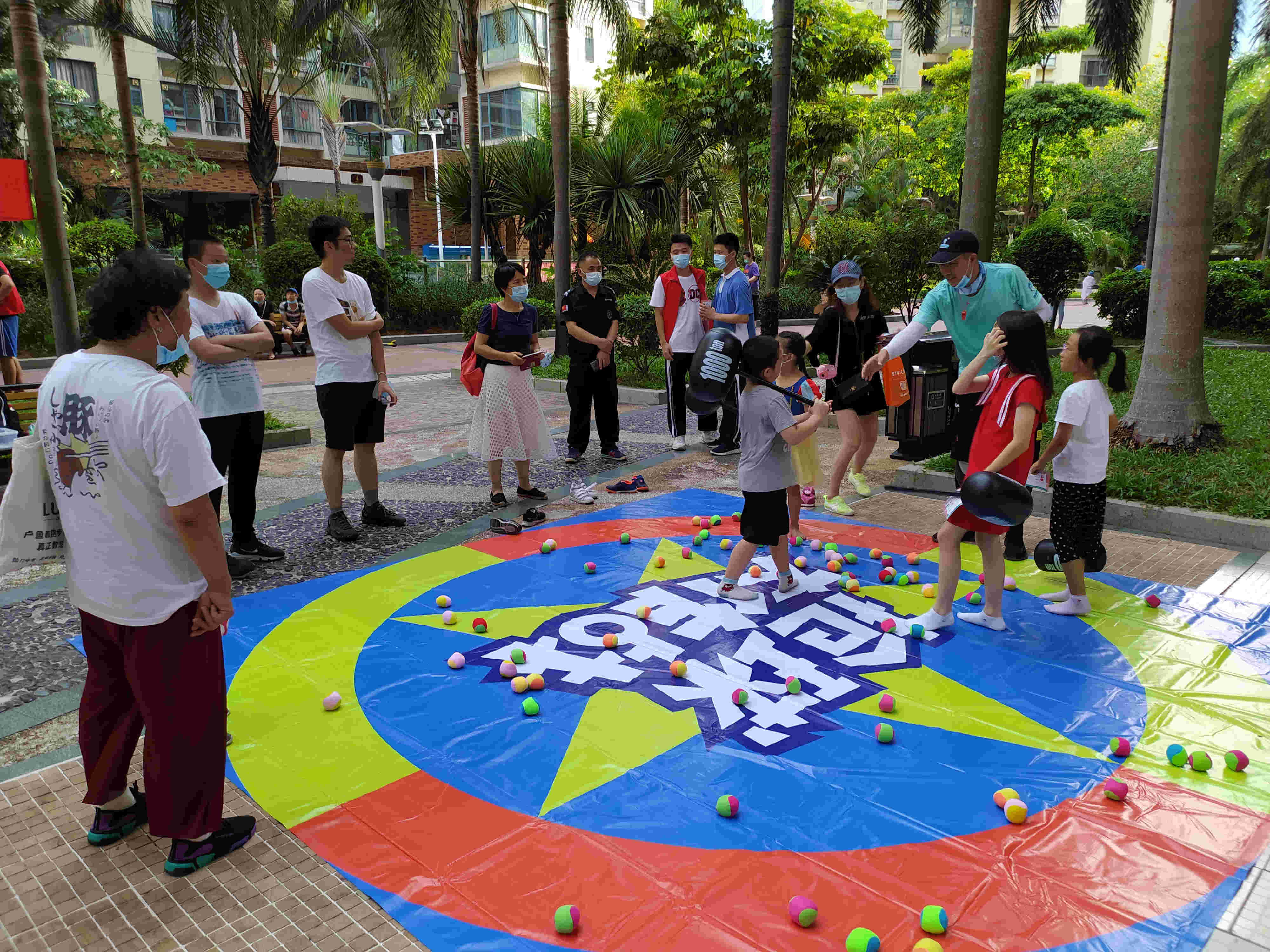 小朋友拿著充氣錘子道具,守護(hù)在圈內(nèi)的小彩球,家長(zhǎng)們?cè)谌ν?,?分鐘內(nèi)小朋友守護(hù)彩球,不被家長(zhǎng)搶奪超過30個(gè)彩球,為通過成功。作用:促進(jìn)家長(zhǎng)和小孩的互動(dòng)和運(yùn)動(dòng)。