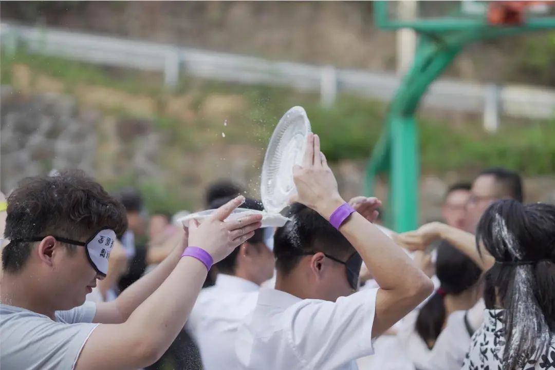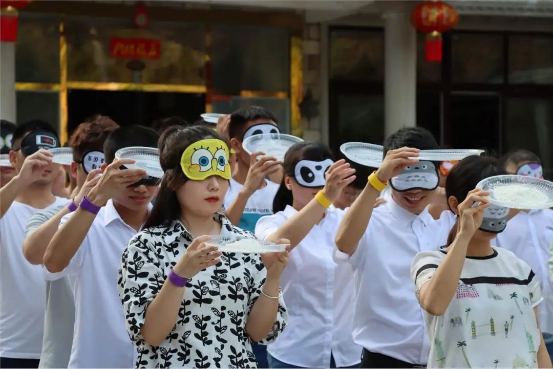 除了力量與才智,工作中更不可缺的是團(tuán)隊(duì)協(xié)作能力,接下來的這個(gè)游戲尤其考驗(yàn)隊(duì)員的默契。每組隊(duì)員戴上眼罩向背后隊(duì)員傳遞面粉,藍(lán)隊(duì)通過完美的配合,以傳遞面粉量最多者獲得第一,積3分。