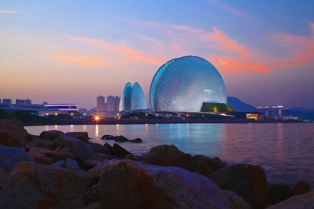 而珠海大劇院位于野貍島海濱,就像是一大一小兩組“貝殼”的形體,白天呈現(xiàn)半通透效果,一到夜晚則像月光一樣晶瑩剔透。